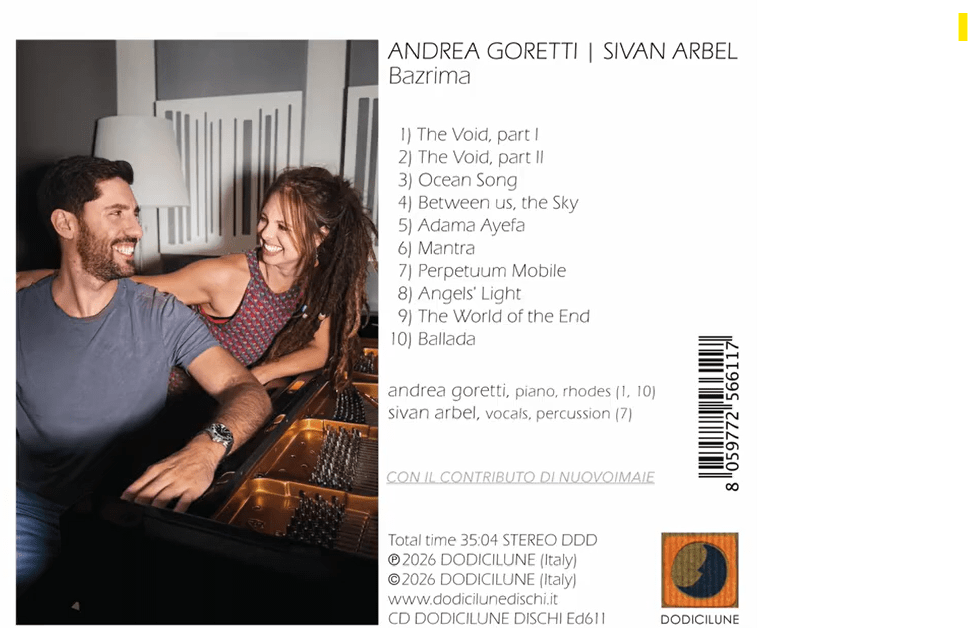 Bazrima — il nuovo disco condiviso con Andrea Goretti è uscito il 28 gennaio 2026 ed è il primo album ufficiale del duo. Dove Sivan Arbel lavora sia come vocalist che autrice; Andrea Goretti, è un eccellente pianista e compositore milanese, classe ’90. Andrea ha talento,gusto,ed una certa sensibilità. Forse dovuta alla sua formazione che spazia dalla musica classica al Jazz, ( e non è scontato che tutti i pianisti abbiano questo percorso) e riesce a combinare elementi di avanguardia, influenze impressioniste-romantiche contemporanee, a giochi poliritmici, fluidi, mutevoli, tipici del linguaggio jazzistico, in un approccio intimo e personale.