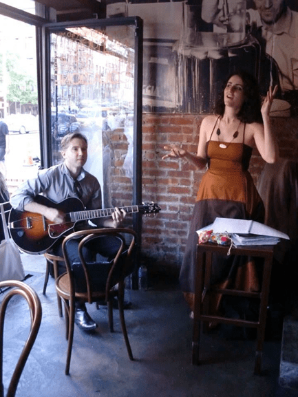 “I got my first gig in a very nice cafeè in New York folks! One of those pretty, little cafè on the south, the east side that Jeff Buckley was speaking about in his album…for me was fun and exciting! There it was possible to enjoy a good dish or a hot coffee chatting with your best buddy about life pleasures and pains. I was accompanied by the best, Anton Alexeev on guitar, a very versatile musician with roots in Russia and feet into the deep American traditional music. My buddy and I had fun entertaining people with some famous Italian standards as Modugno and Mina classics and some songs also from the great American songbook. A very exciting evening with a very joyful audience who was ready to join us with their pure love for music and…passion for good food, all Italy inspired. “- Pamelie